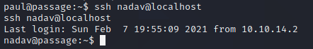 Well, I have paul, but what can I do with it? The account isn't a member of any groups, and there's nothing interesting besides the user.txt flag in its home directory. First thing, I add my public key to the account's ~/.ssh/authorized_keys file, and notice there's already one there - nadav seems to have public-key access to paul's account. I'd be lying if I said I figured it out right away, but after spending a chunk of time poring over enumeration script output, I try to ssh into the nadav account on a whim, and...yep.