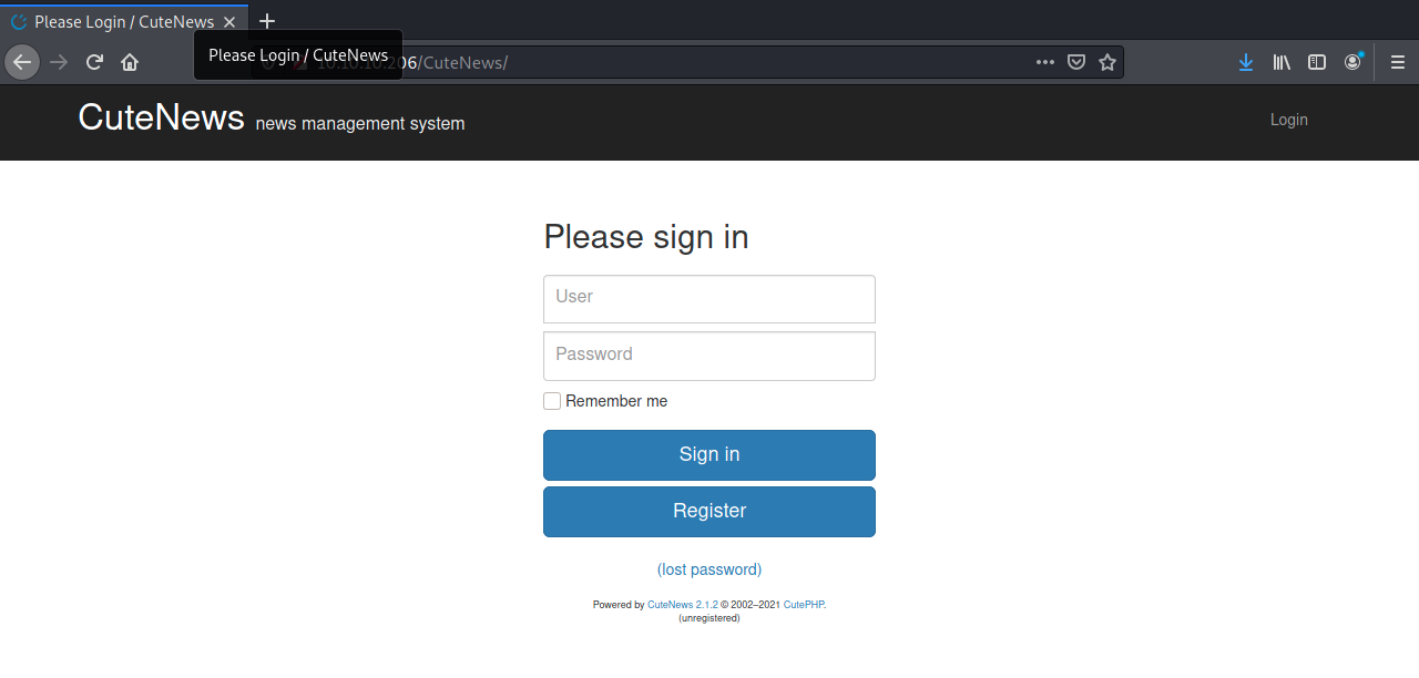 Scrolling to the bottom, I see a little masthead labeled "Powered by CuteNews". Immediately this seems like a fake CMS specially made for this box, so I was surprised to follow the link in the masthead to a GitHub page and find actual users active in the issues pane. Fortunately, these users were all complaining about a still-unpatched security vulnerability allowing for RCE. Perfect.