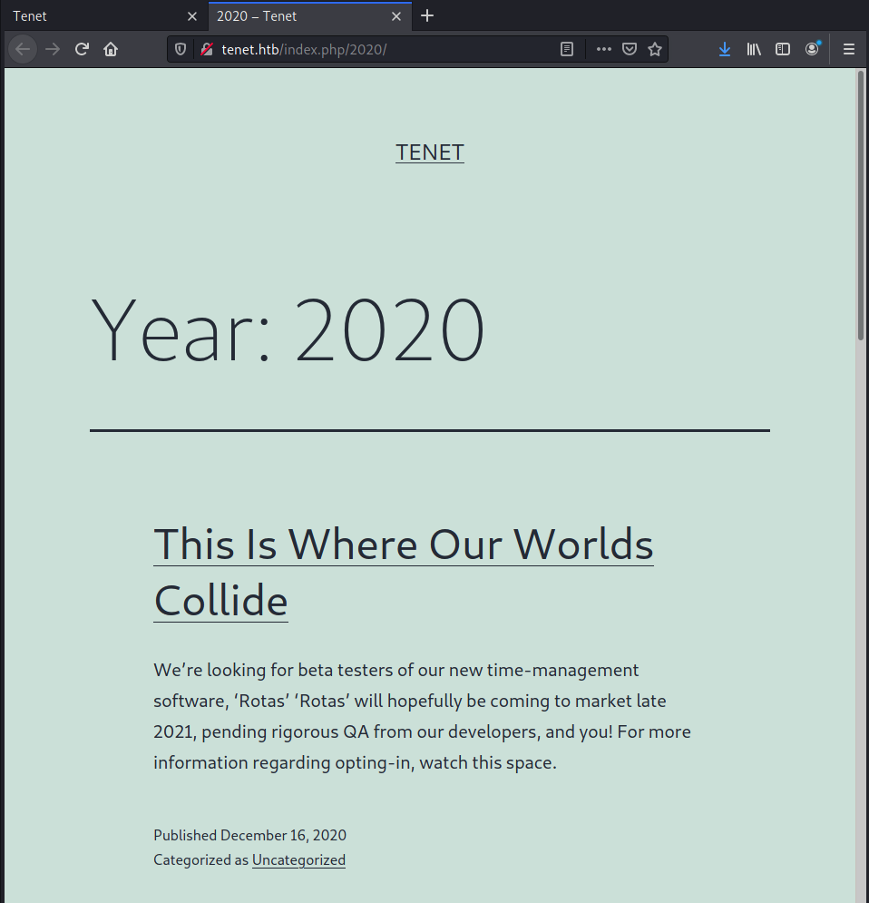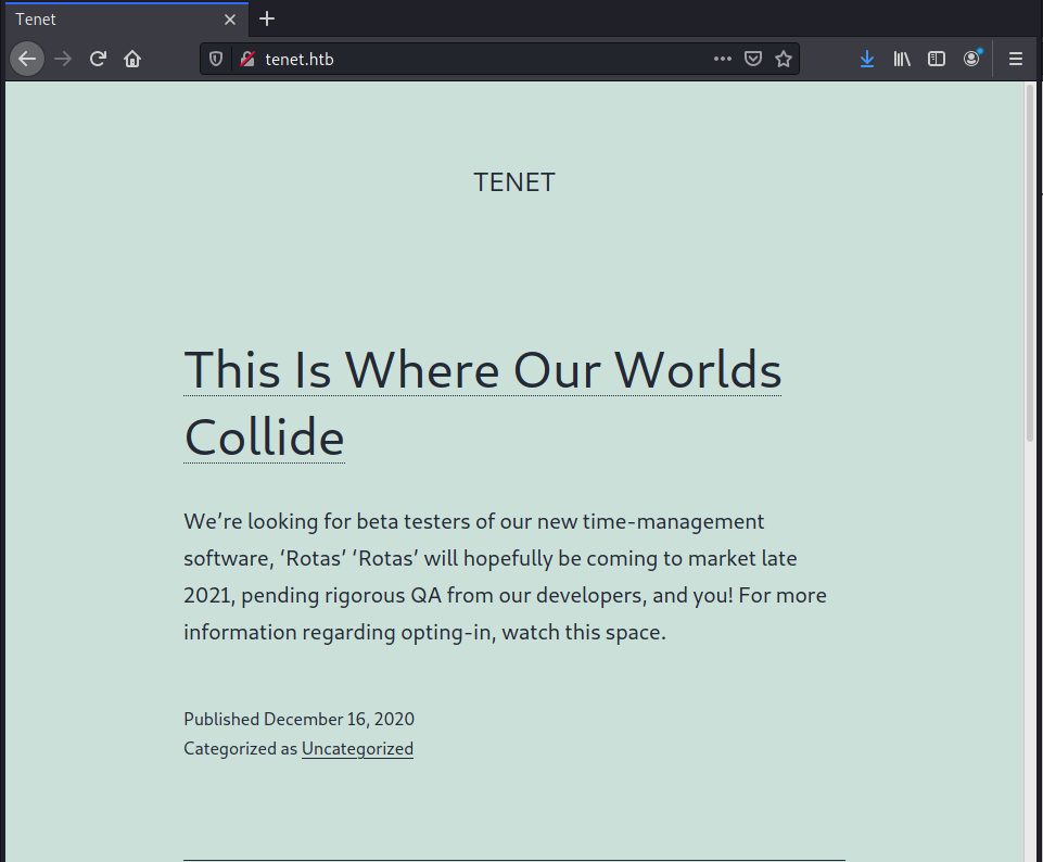 I didn't like the movie Tenet very much - watching it felt like solving a suduko with explosions ringing in my ears - but hopefully this box will be more enjoyable. As always, first step's to plug it into my map.sh shell script. There, I find an Apache server on port 80 and SSH on 22. Pulling up "tenet.htb" in my web browser, I see a WordPress-type blog.