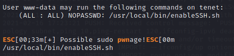 While John the Ripper worked to decrypt these hashes (ultimately fruitlessly), I ran my favorite Linux post-exploitation script, which alerted me to the fact that my current account, www-data, can run the "/usr/local/bin/enableSSH.sh" script as root! Seems promising.