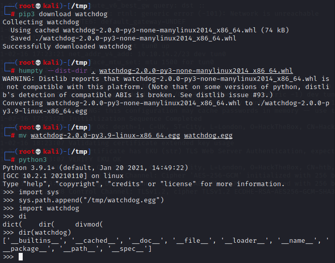 This script is pretty straightforward - it copies a provided public key to a randomly generated file in /tmp, then copies the contents of that file to "/root/.ssh/authorized_keys". Fortunately for me, the umask permissions with which that file in /tmp are created aren't restrictive enough, and any user can write to it in the short interval before it's copied and deleted. So, all I need to do is monitor /tmp for any new files, write my own public key to them as quick as possible, and hope my script wins the race (condition). I decide to write my file monitor program in Python using the watchdog module, which, of course, the target machine doesn't have installed. Nor, it seems, does it have pip, and I'd need root access to install that. No problem - time for one of my favorite post-exploitation tools, Humpty, which lets me package most any Python wheel into a super-portable .egg file I can drop on a target machine and import just like an installed module.