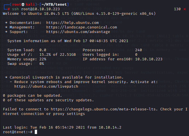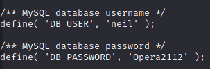 That's right, no user step! I love going from a foothold straight to root, and I was happy that this box let me do so. I have to admit that I did miss a very basic step that would have given me neil's user flag a bit sooner, but I'm certain I would have found it if the path to root weren't so immediately clear. First thing, I popped open the "wp-config.php" file for the "tenet.htb" blog I saw earlier, and found some MySQL database credentials.