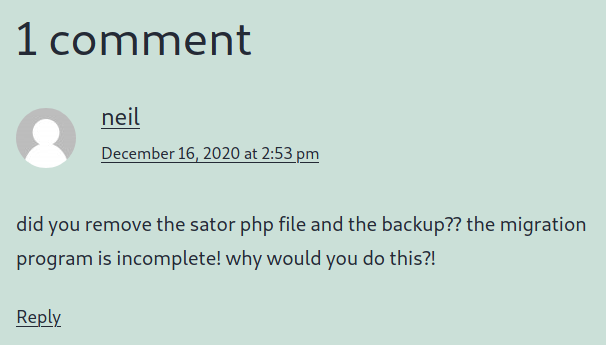 There's a comment on that post from the user "neil", irate over the removal of the "sator" PHP file and backup.